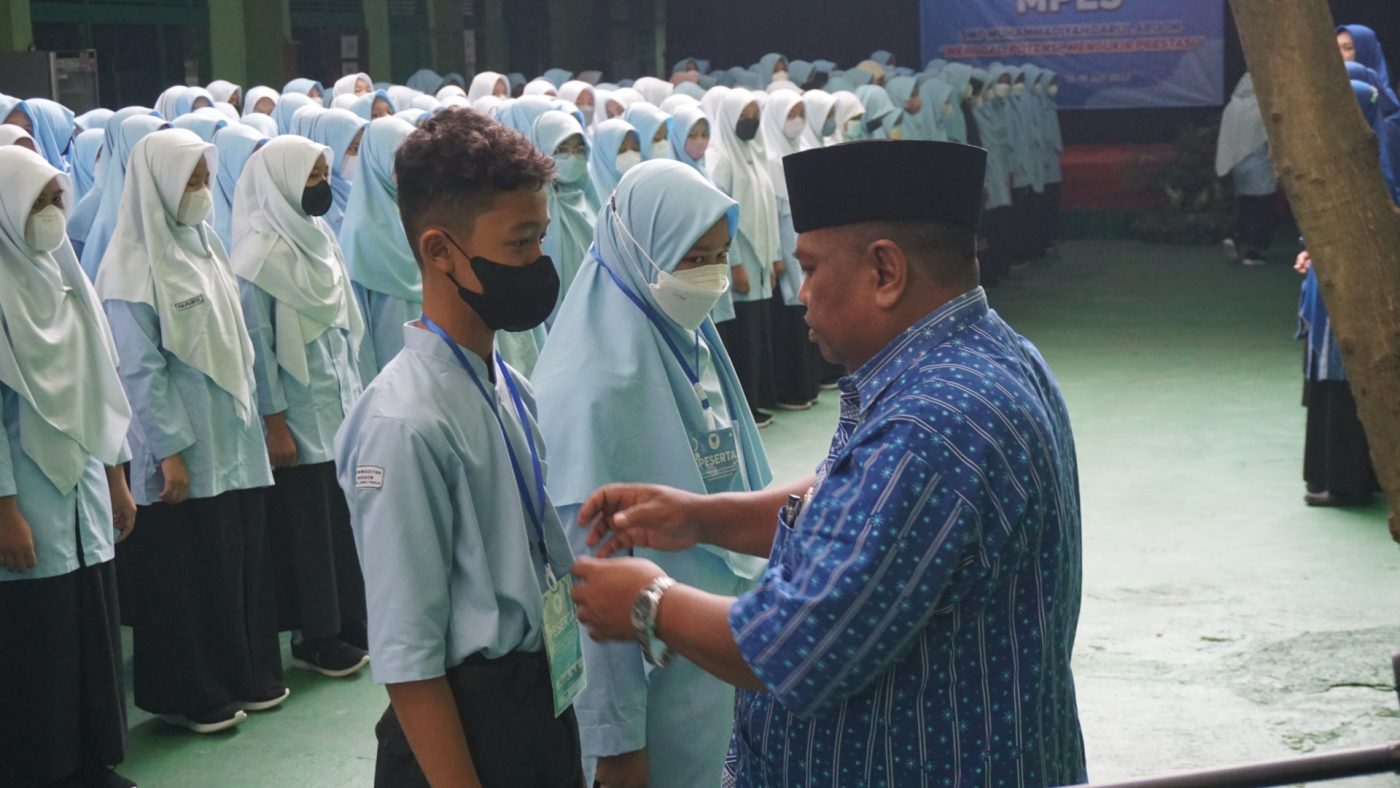 Seluruh peserta didik baru mengikuti apel saat Masa Pengenalan Lingkungan Sekolah (MPLS) di SMP Muhammadiyah Darul Arqom, Rabu (13/Juli/2022). Para peserta didik mulai masuk sekolah atau jadwal hari pertama masuk sekolah untuk tahun ajaran 2022/2023 mulai hari ini Rabu (13/Juli/2022). Tak langsung di isi dengan kegiatan belajar mengajar (KBM), hari pertama masuk sekolah di isi dengan kegiatan Masa Pengenalan Lingkungan Sekolah (MPLS) yang dilaksanakan mulai hari Rabu (13/Juli/2022) sampai dengan Jumat (15/Juli/2022).