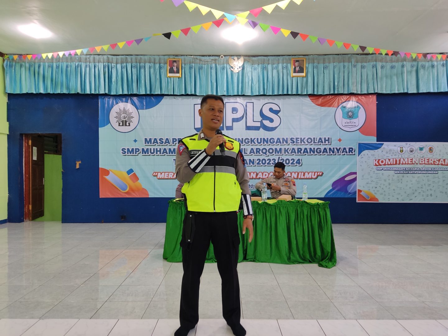 Tamu tersebut yaitu Polres Karanganyar dan Satlantas. Dua pembicara tersebut memberikan pengetahuan tentang Tertib berlalulintas dan bahaya Napza. Di sesi pertama siswa berdiskusi tentang bahaya Napza dengan Polres Karanganyar. Pembicara menyampaikan beberapa pengetahuan tentang jenis dan bahaya Napza. Beberapa siswa juga memberikan pertanyaan baik secara langsung maupun melalui secarik kertas. “Sebagai generasi hebat kalian harus menghindari berbagai jenis narkoba. Karena obat-obatan ini sangat berbahaya.” Tutur pemateri. Beberapa siswa tampak mencatat materi yang diberikan. Di sesi kedua siswa mendapatkan pengetahuan tentang Tertib berlalulintas. Beberapa pengetahuan penting didapatkan siswa. Sebelum dua materi tersebut siswa mendapatkan pengetahuan tentang tata tertib siswa SMP Muhammadiyah Darul Arqom. Di sesi ini juga diadakan sesi tukar kado berupa makanan siap santap yang dibungkus dengan sangat menarik. Beberapa siswa sangat antusias ketika mendapatkan hadiah. MPLS kali ini didesain berbeda dengan pelaksanaan tahun sebelumnya. Selain kehadiran tim media yang melaporkan kegiatan setiap hari juga materi baru seperti Antiperundungan yang dijadikan topik utama.