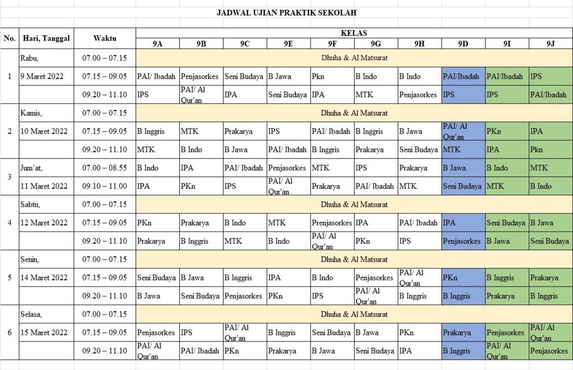 Memasuki masa-masa akhir bagi siswa-siswi kelas IX di SMP Muhammadiyah Darul Arqom Karanganyar tahun pelajaran 2021/2022, panitia ujian SMP Muhammadiyah Darul Arqom Karanganyar menyelenggarakan Ujian Praktik Sekolah bagi peserta didik kelas IX. Ujian praktik sekolah dilaksanakan mulai tanggal 9 Maret 2022 sampai dengan tanggal 15 Maret 2022 yang dilaksanakan di SMP Muhammadiyah Darul Arqom Karanganyar. Sebagaimana yang kita ketahui bahwa Ujian Praktik Sekolah merupakan alat ukur kemampuan peserta didik dalam menguasai hasil belajar di sekolah. Beberapa hal penting terkait persyaratan kelulusan peserta didik di jenjang akhir adalah menyelesaikan seluruh program pembelajaran, memperoleh sikap sopan/perilaku minimal baik dan mengikuti Ujian yang diselenggarakan oleh Satuan Pendidikan. Ujian Praktik Sekolah merupakan salah satu ujian yang diselenggarakan oleh sekolah. Seluruh peserta didik wajib mengikuti dan menyelesaikan ujian praktik untuk memenuhi syarat kelulusan. Ujian praktik sekolah menetapkan jadwal mata pelajaran sebagai berikut: