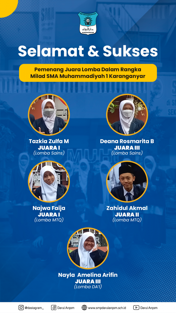 SMP Muhammadiyah Darul Arqom Karanganyar memborong 5 piala juara di ajang lomba yang diselenggarakan oleh SMA Muhammadiyah 1 Karanganyar.