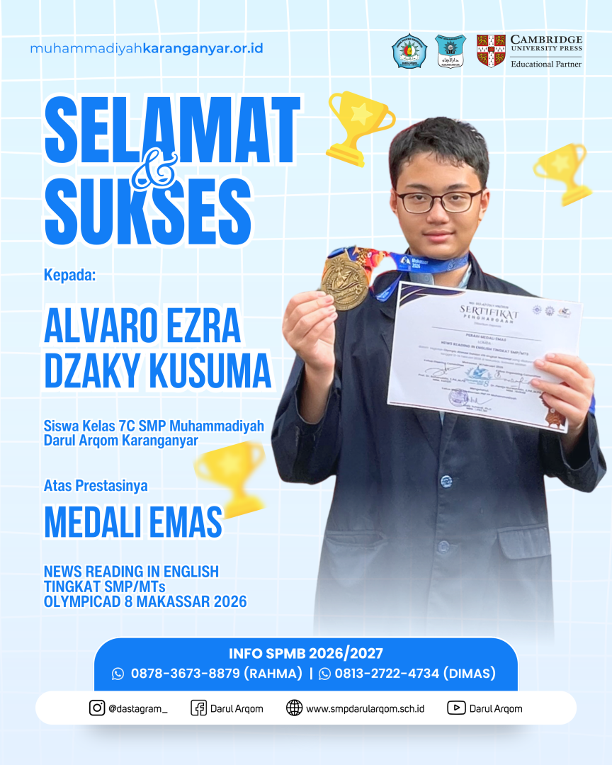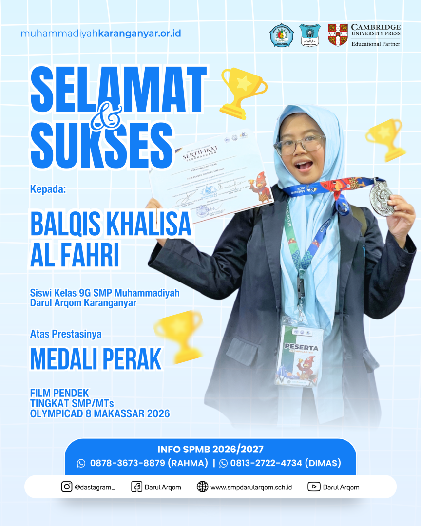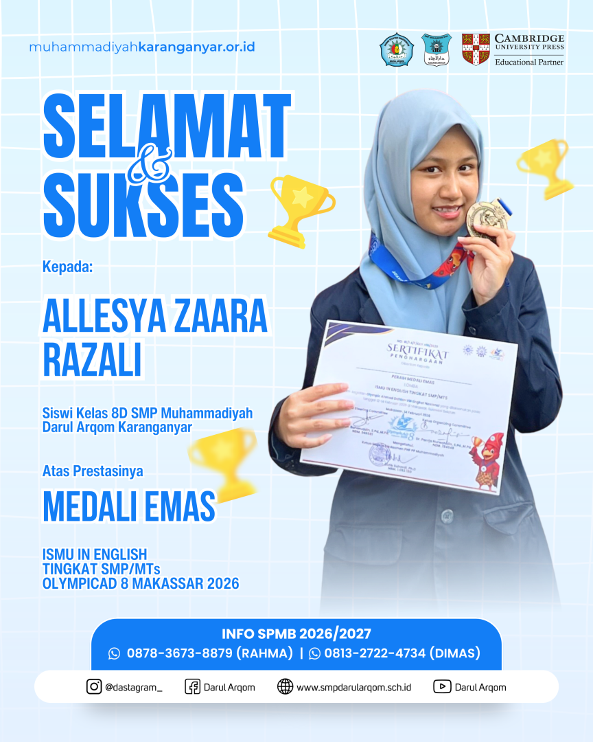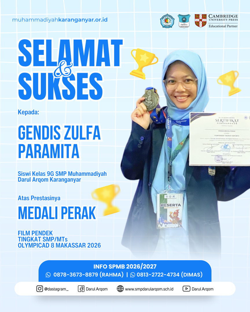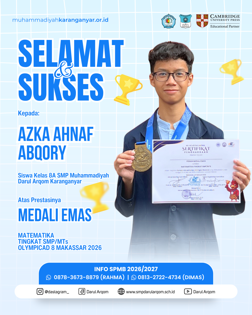 Makassar (14/2) – SMP Muhammadiyah Darul Arqom Karanganyar kembali menorehkan prestasi mengharumkan di ajang nasional. Kali ini, kontingen sekolah tersebut berhasil memborong 5 medali dari ajang Olimpiade Ahmad Dahlan (OlympicAD) ke-8 yang diadakan di Makassar, Sulawesi Selatan.